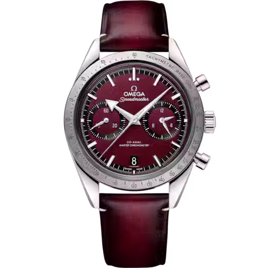 The watch is presented on a burgundy leather strap with an OMEGA logo in postive relief on the buckle, and is driven by the manual-winding OMEGA Co-Axial Master Chronometer Calibre 9906.